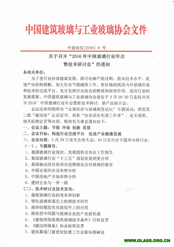 关于召开"2016年中国玻璃行业年会暨技术研讨会"的通知