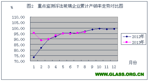 依据中国建筑玻璃与工业玻璃协会对全国重点监测浮法玻璃企业月快报数据综合统计显示:本月产量和销售量与去年同期相比都有所增加; 2013年1-8月份累计产量同比增加14.46%;累计销售量同比增加13. 87%;本月期末库存4410万重量箱,同比库存增加442万重量箱,环比库存增加19万重量箱;本月综合加权平均价格66.50元/重量箱,环比上升2.25元/重量箱,同比上升4.39元/重量箱。