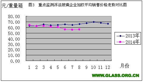 依据中国建筑玻璃与工业玻璃协会对全国重点监测浮法玻璃企业月末数据综合统计显示:本月产量、销售量与去年同期相比都有所增加; 2014年8月份累计产量同比增加11.57%,累计销售量同比增加11.94%;本月期末库存4632万重量箱,与去年同期相比增加286万重量箱,与上月相比减少520万重量箱;本月综合加权平均价格,环比上升0.48元/重量箱,同比下降9.94元/重量箱。