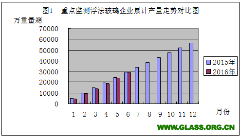 本月生产浮法玻璃4735万重量箱,与去年同期相比多生产13万重量箱。累计产量为28536万重量箱,同比减少1.76%,(见图1)。累计产量最多的省份是:河北省8459万重量箱,同比减少19.16%;山东省2787万重量箱,同比减少26.23%;湖北省2695万重量箱,同比增加79.55%(统计范围扩大);福建省2363万重量箱,同比减少0.92%;广东省2152万重量箱,同比增加13.08%;