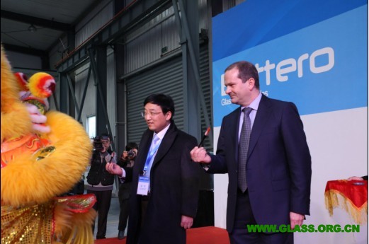 图为:保特罗玻璃工业(佛山)有限公司总经理安杰文先生与烟台长裕玻璃有限公司董事长朱鹏程先生在保特罗上海青浦新工厂为狮子点睛
