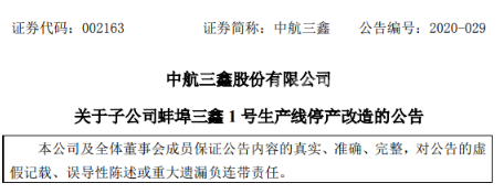 中航三鑫公布,公司控股子公司中航三鑫太阳能光电玻璃有限公司(“蚌埠三鑫”)投资建设的250t/d超白太阳能玻璃生产线(“1号生产线”)于2009年11月建成点火,现临近炉窑最大设计运行年限,出现炉窑整体老化,池壁、池底侵蚀严重,运行安全风险上升等问题。为此蚌埠三鑫拟对1号生产线实施停产技术改造,经公司六届二十八次董事会审议批准,该技改项目已列入2020年度固定资产投资计划。蚌埠三鑫根据相关工作安排,4月底前将启动1号生产线停窑工作;上述停产改造事项不会对公司生产经营活动产生重大影响。