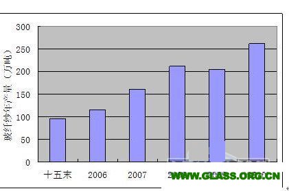全国玻璃行业在“十一五”期间受我国的房地产建设情况而波动。2005年全国平板玻璃产量为4.02亿重量箱,至2010年全国平板玻璃产量达6.3亿重量箱,同比增长10.9%,效益更是创历史最好年份,全年销售收入预计为690亿元,同比增长32.8%,利润超73亿元,同比增长13%。平板玻璃产量“十一五”平均年增长11.2%,整个“十一五”产量增长了56%。(见图4)