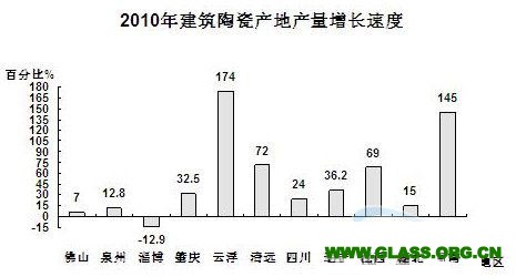 我国的陶瓷行业在“十一五”期间不断推陈出新,产量也大幅度提高。2005年建筑陶瓷产量为35亿平方米,卫生陶瓷产量8000亿件,五年后的2010年,建筑陶瓷产量为78.09亿平方米,同比增长19.6%,销售收入预计为2500亿元,同比增长30%,利润将达150亿元,同比增长31.5%。卫生陶瓷产量为1.74亿件,销售收入预计330亿元,利润将达27.5亿元。“十一五”期间,建筑陶瓷产量增长了125.4%,卫生陶瓷产量增长了117.5%。从2010年看,陶瓷产量最大省仍在广东,其次是福建,以建筑陶瓷为例,广东已占全国总量的四分之一(见图6),产量达到近20亿平方米。