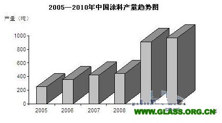 2010年我国涂料产量为966.6万吨,同比上升22.8%,其中建筑涂料为351.9万吨,同比上升23.7%,继2009年后又迎来了一个较大的发展(见图7)。
