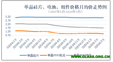 3月,受疫情“黑天鹅”事件影响,国内市场启动延后,装机市场主要依靠海外需求支撑。但3月中下旬,海外疫情蔓延,国外市场需求放缓,导致国内组件出口受阻,电池片、组件库存积压,市场议价能力走弱,价格逐层传导,硅料端、辅料端价格承压走低,光伏玻璃也打破连续横盘15个月的走势,首次下跌。