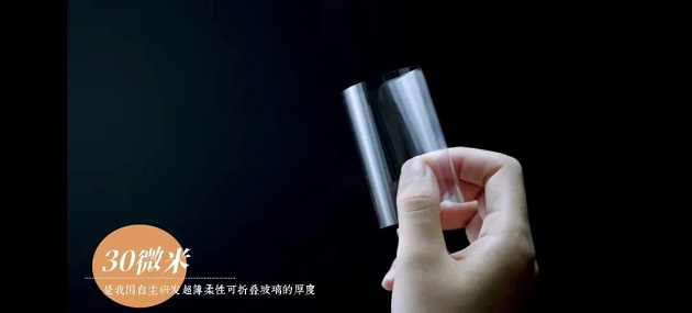 30微米柔性可折叠玻璃各项技术指标国际领先,薄如蝉翼、刚韧其中,可连续弯折上百万次不破损,从源头上保障了中国信息显示产业链供应链安全,这是凯盛科技集团在中国建材集团战略引领下,在微观世界中精益求精,积聚量变实现质变的典型,再次刷新了创新下的中国精度,坚守中的世界前沿,将微观世界的一小步折射出中国智造的一大步。
