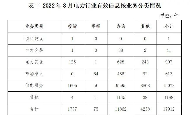 电力行业排在首位,有效信息数量为17912件,占全部有效信息的80.75%。群众关注的内容主要集中在供电服务、电力安全、市场准入等方面。(2022年8月电力行业有效信息按业务分类情况见表二)