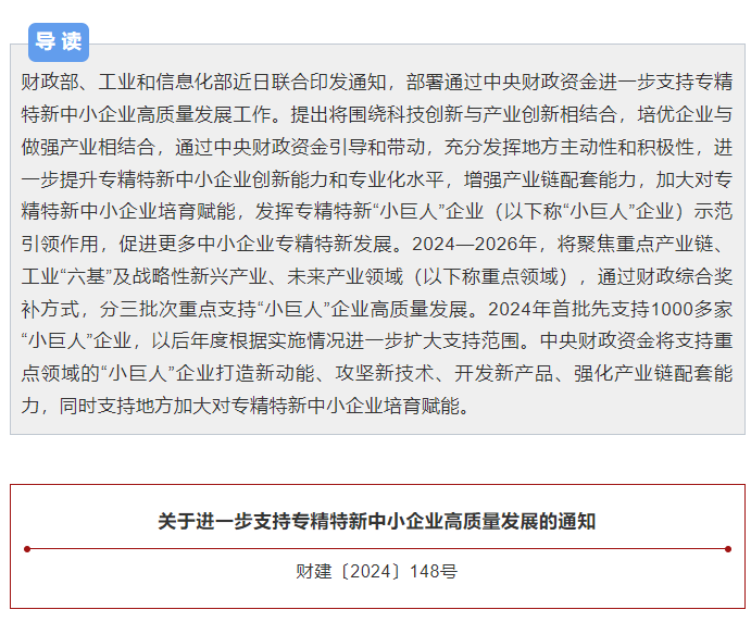 为深入贯彻习近平总书记关于“激发涌现更多专精特新中小企业”的重要指示精神,落实党中央、国务院决策部署,财政部、工业和信息化部(以下称两部门)通过中央财政资金进一步支持专精特新中小企业高质量发展,为加快推进新型工业化、发展新质生产力、完善现代化产业体系提供有力支撑。现将有关事项通知如下: 深入贯彻习近平总书记重要指示批示精神,围绕科技创新与产业创新相结合,培优企业与做强产业相结合,通过中央财政资金引导和带动,充分发挥地方主动性和积极性,进一步提升专精特新中小企业创新能力和专业化水平,增强产业链配套能力,加大对专精特新中小企业培育赋能,发挥专精特新“小巨人”企业(以下称“小巨人”企业)示范引领作用,促进更多中小企业专精特新发展。