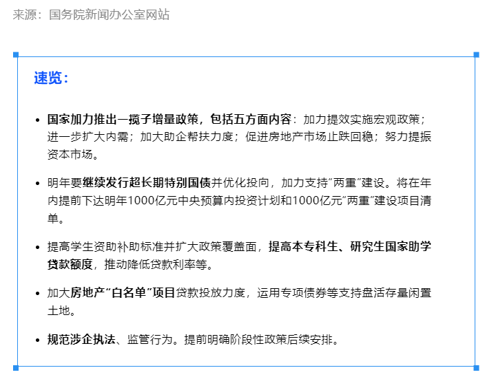(五)努力提振资本市场。有关部门将采取有力有效的综合措施,大力引导中长期资金入市,打通社保、保险、理财等资金入市堵点,支持上市公司并购重组,稳步推进公募基金改革,研究出台保护中小投资者的政策措施。目前各项政策正在加快推出。