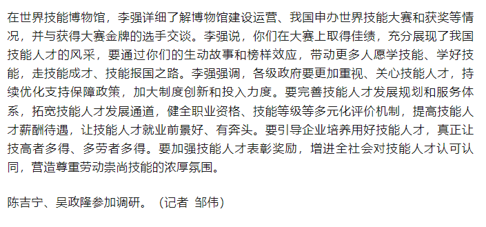 李强在上海调研技能人才工作时强调 积极适应经济社会发展需要 大力加强职业教育和技能人才培养