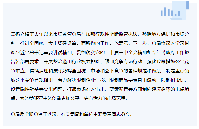3月19日,市场监管总局党组成员、副局长孟扬主持召开2025年第二次企业公平竞争座谈会,围绕“破除地方保护和市场分割、加快推进全国统一大市场建设”主题,与国家管网集团、三一集团、安谱科技、思源电气、敬业集团、华润医药、君乐宝乳业等7家企业负责人深入交流,了解企业遇到的问题和困难,听取意见建议。相关司局负责同志对企业提出的问题和意见作了具体回应。