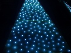 发光玻璃是将贴片型LED发光管粘贴在玻璃中并且采用透明型导线连接而成的一种新型的玻璃。通电时LED闪闪发光、五彩缤纷;而玻璃仍然保持整体的通透性。在门窗、隔断和屋顶的装潢中正在受到人们的关注,在诸如家具、灯具等产品的应用中也开始引起大家的重视。