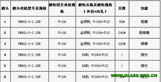 机器简介:机器适用于平板玻璃直线斜边的磨削和抛光,内设置了三轮粗磨、三轮精磨、二轮气动抛光、一轮磨底,无级变速器调整加工速度。并采用PLC可编程序控制器进行电脑自动或手动控制的功能,液晶显示触摸屏可设定所加工玻璃的厚度、磨削后剩余底边厚度及斜边宽度,并以图形及数字显示于屏幕,由设定至粗、精、抛加工能一次完成。