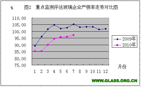 2009年与2010年重点监测浮法玻璃企业累计销售率走势对比图(2010年7月份)