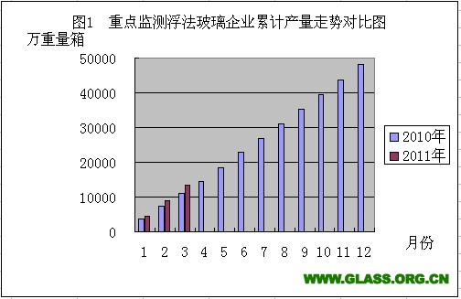 2010年与2011年重点监测浮法玻璃企业累计产量走势对比图(2011年3月份)