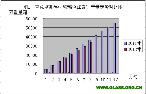 2011年与2012年重点监测浮法玻璃企业累计产量走势对比图(2012年8月份)