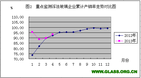 2012年与2013年重点监测浮法玻璃企业累计销售率走势对比图(2013年4月份)