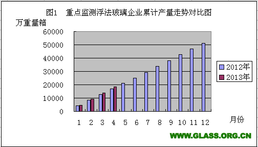 2012年与2013年重点监测浮法玻璃企业累计产量走势对比图(2013年4月份)
