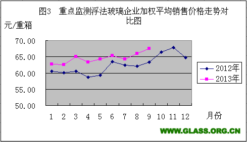 2012年与2013年重点监测浮法玻璃加权平均销售价格走势对比图
