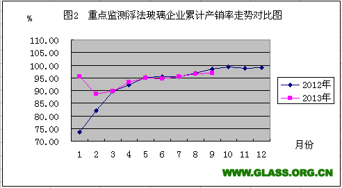 2012年与2013年重点监测浮法玻璃企业累计销售率走势对比图(2013年9月份)