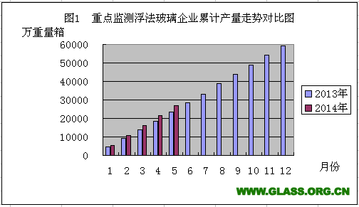 2013年与2014年重点监测浮法玻璃企业累计产量走势对比图(2014年5月份)