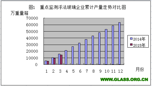 2014年与2015年重点监测浮法玻璃企业累计产量走势对比图(2015年3月份)