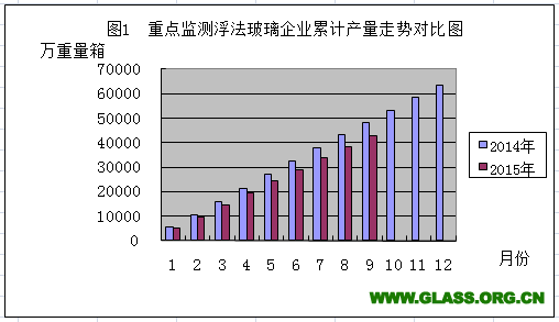 2014年与2015年重点监测浮法玻璃企业累计产量走势对比图(2015年9月份)