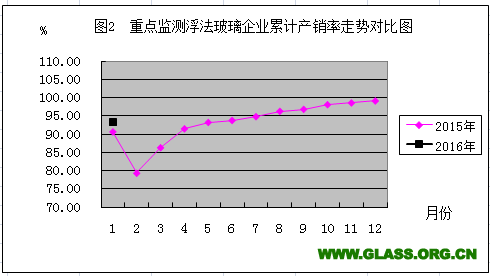 2015年与2016年重点监测浮法玻璃企业累计销售率走势对比图(2016年1月份)