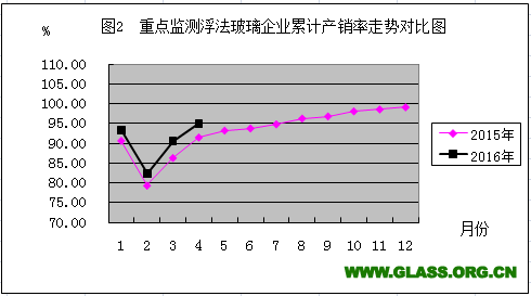 2015年与2016年重点监测浮法玻璃企业累计销售率走势对比图(2016年4月份)