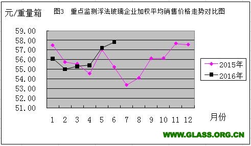 2015年与2016年重点监测浮法玻璃加权平均销售价格走势对比图