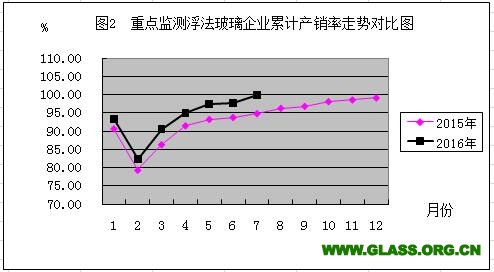 2015年与2016年重点监测浮法玻璃企业累计销售率走势对比图(2016年7月份)
