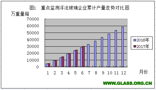 2016年与2017年重点监测浮法玻璃企业累计产量走势对比图(2017年6月份)
