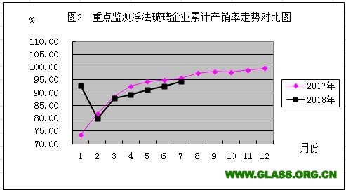 2017年与2018年重点监测浮法玻璃企业累计销售率走势对比图(2018年7月份)