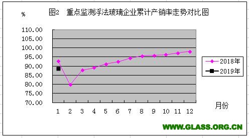 2018年与2019年重点监测浮法玻璃企业累计销售率走势对比图(2019年1月份)