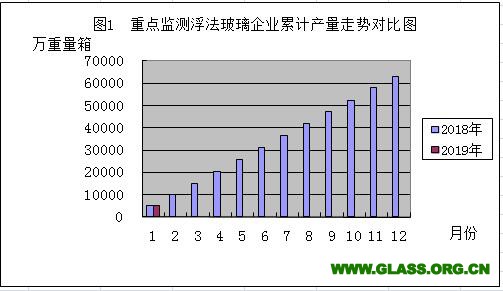 2018年与2019年重点监测浮法玻璃企业累计产量走势对比图(2019年1月份)