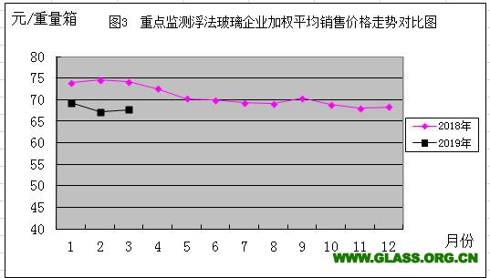 2018年与2019年重点监测浮法玻璃加权平均销售价格走势对比图
