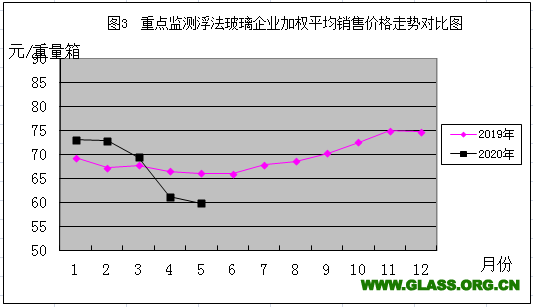 2019年与2020年重点监测浮法玻璃加权平均销售价格走势对比图