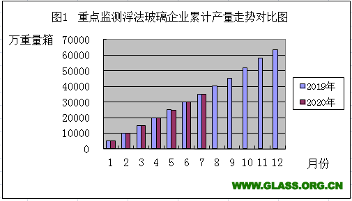 2019年与2020年重点监测浮法玻璃企业累计产量走势对比图(2020年7月份)