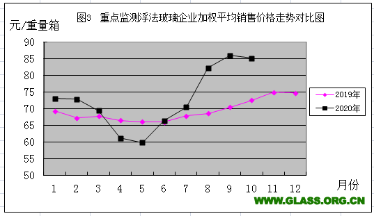 2019年与2020年重点监测浮法玻璃加权平均销售价格走势对比图