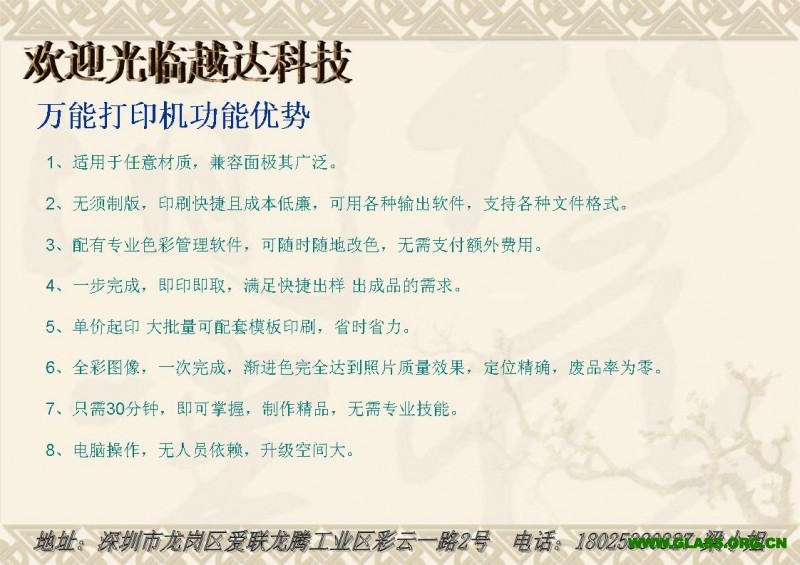 越达有机玻璃打印设备是一种“与物体非接触”的喷墨印刷型高科技数码印制设备。实现计算机数据输出到万能打印机_直接在物体上喷印!可将高精度的图像打印在物体表面,不受任何材料限制,可以在木板、玻璃、水晶、PVC、ABS、亚克力、金属、塑料、石材、皮革、布料及其它纺织品等表面进行彩色印刷。无需制版、无需晒版和重复套色,色彩艳丽丰富,效果逼真,图像防水,防晒,耐磨损,不褪色,操作简单方便,印刷图像速度快,完全符合印刷工业标准。投入成本低,并且是高品质低价位的产品,很多方面正在取代原来所使用的丝网印刷等工艺。