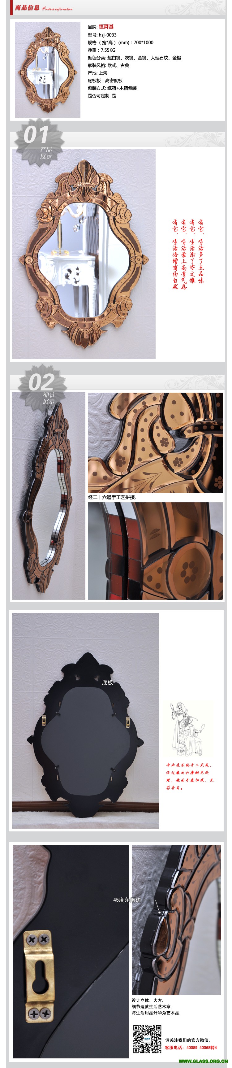 恒舜基”艺术玻璃主要产品有国内首创的闪光冰钻玻璃系列,精彩钻玻璃系列,曼殊.威尼斯镶嵌彩绘玻璃、彩雕玻璃、水幕墙、玻璃雕塑等玻璃精品,意大利古典宫廷镜为我司新产品,由意大利著名设计师Ferrucc jo Laviani设计,品种多样,风格各异,每件产品纯手工经二十六道工序制作完成。奢华的欧式古典镜以玻璃材质勾勒复杂而华丽的欧式线条;色彩和图案非常民族性,而且镜框的设计也好似欧式宫廷感觉。