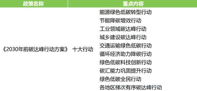 顶层设计中的《2030年前碳达峰行动方案》中提到的10大行动已经明确了“N”的政策范围包括能源、工业、城乡建设、交通运输等行业碳达峰实施方案,以及科技支撑、碳汇能力、能源保障、统计核算、督察考核、财政金融价格等保障政策。