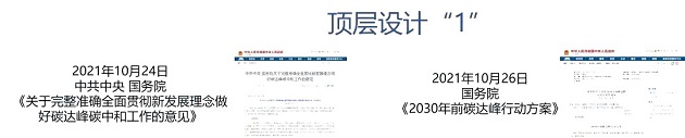 2021年10月24日发布《中共中央 国务院关于完整准确全面贯彻新发展理念做好碳达峰碳中和工作的意见》,作为“1”,是管总管长远的,在碳达峰碳中和“1+N”政策体系中发挥统领作用;意见与同年10月26日国务院发布的《2030年前碳达峰行动方案》共同构成贯穿碳达峰、碳中和两个阶段的顶层设计。“N”则包括能源、工业、交通运输、城乡建设等分领域分行业碳达峰实施方案,以及科技支撑、能源保障、碳汇能力、财政金融价格政策、标准计量体系、督察考核等保障方案。一系列文件将构建起目标明确、分工合理、措施有力、衔接有序的碳达峰碳中和政策体系。