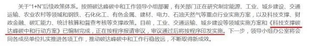 国家发改委在2021年11月份例行新闻发布会中提到《科技支撑碳达峰碳中和行动方案》已编制完成,但目前还未发布。
